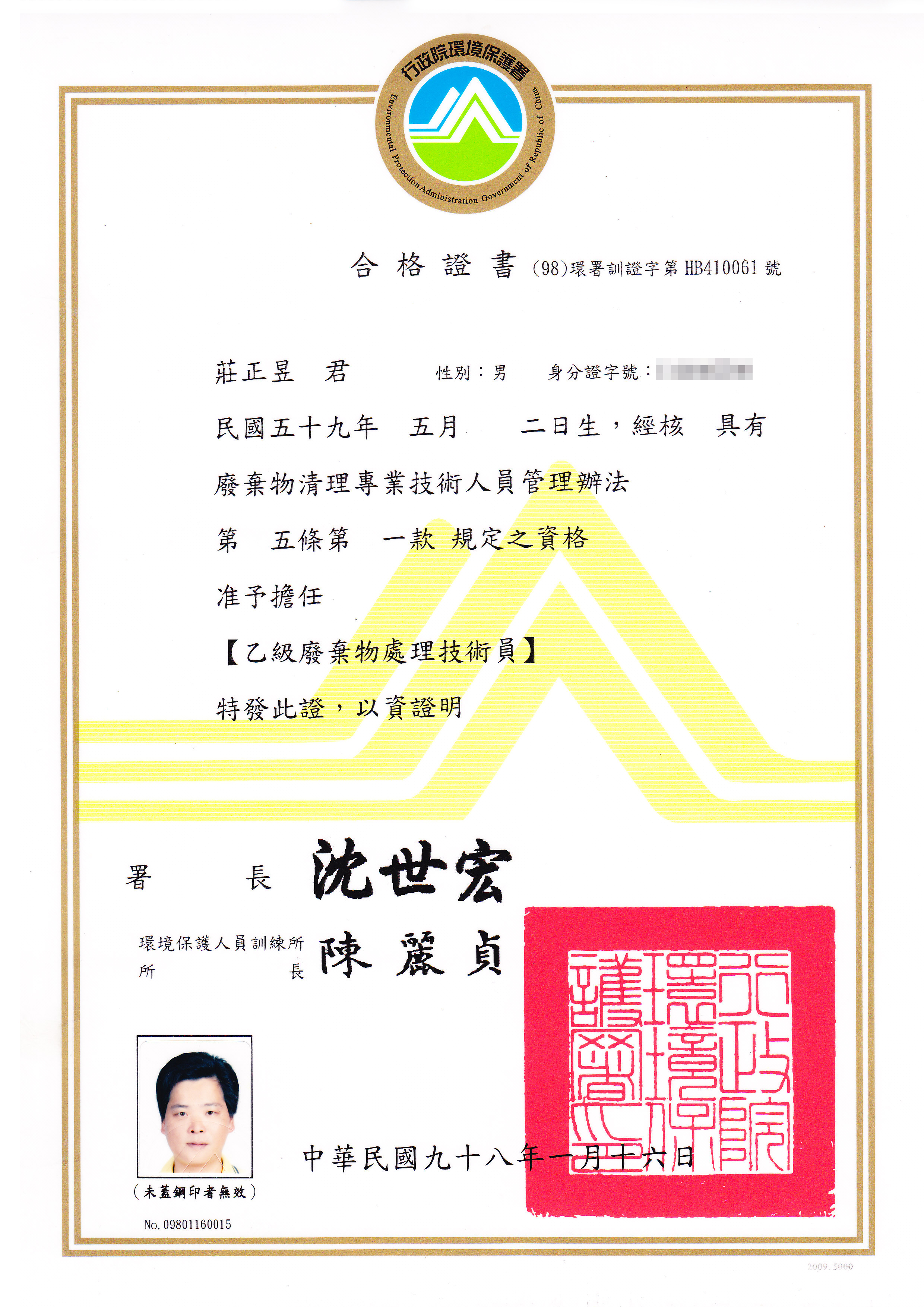 Scan_0005.jpg附表IMG_0001.jpg乙級廢棄物處理人員證書img019.jpg乙級廢棄物處理人員證書